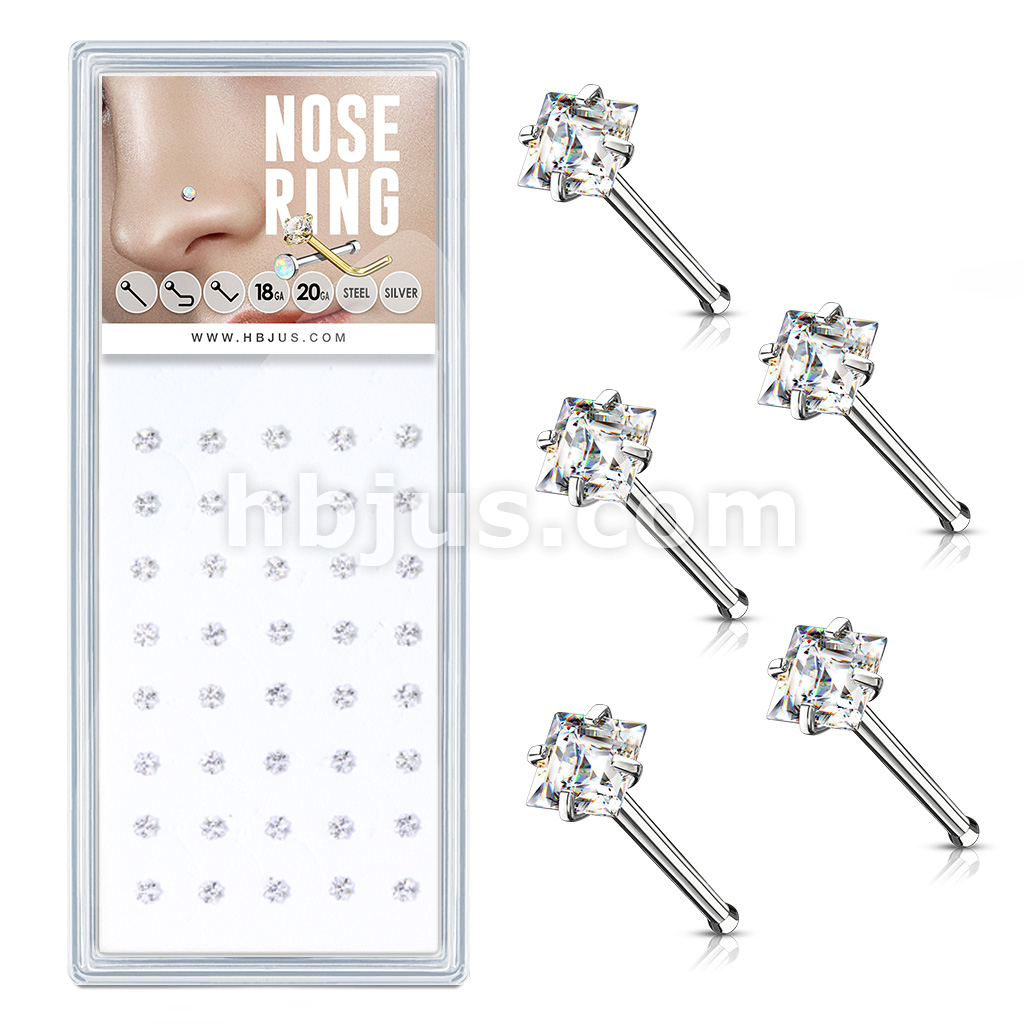 40 Pcs Pre Loaded Box of Clear Prong Set Square CZ Top 316L Surgical Steel Nose Stud Package