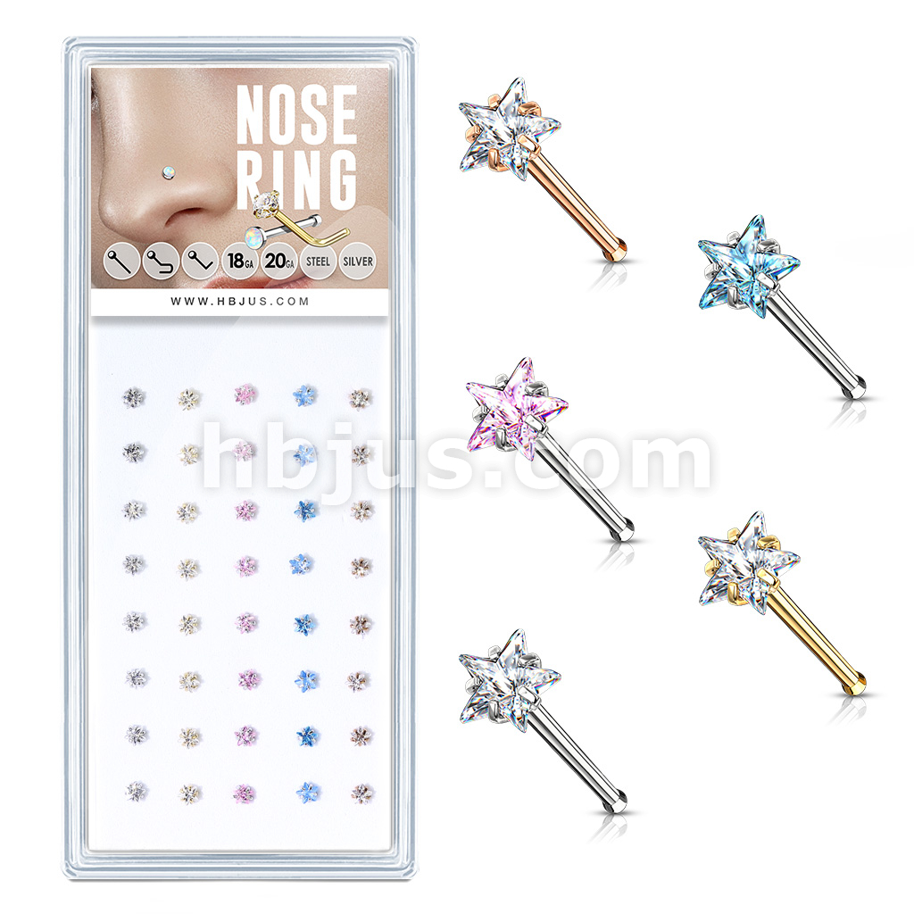 40 Pcs Pre Loaded Box of Prong Set Star CZ Top 316L Surgical Steel Nose Stud Package (5 Colors x 8 Pcs)