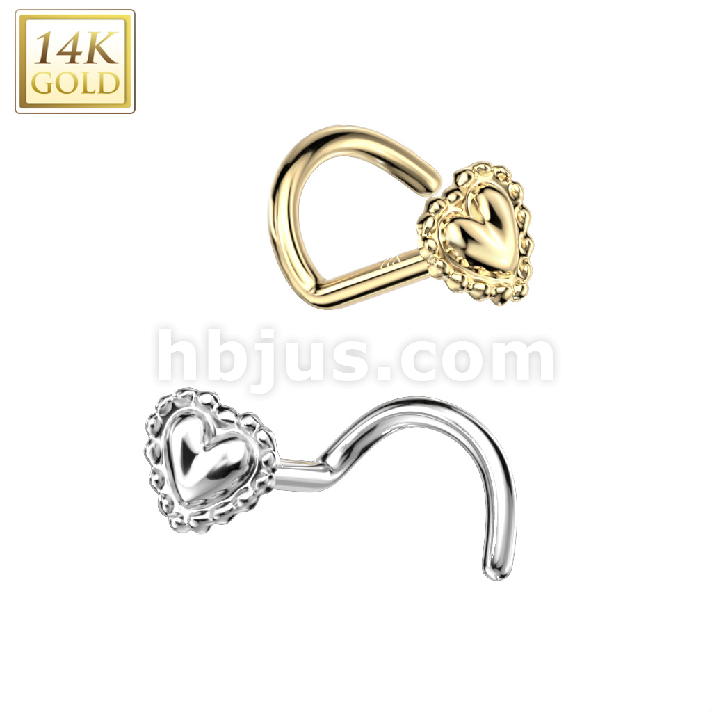 14K Gold Nose Screw Rings With Beaded Edge Heart Top