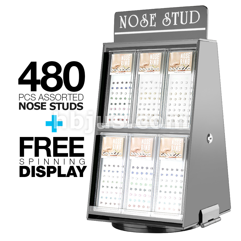 12 Pre Loaded Nose Stud Packs With Rotating Display. Mixed Color Gem on L Bend, Bone and Screw Type. 480 Pcs Total