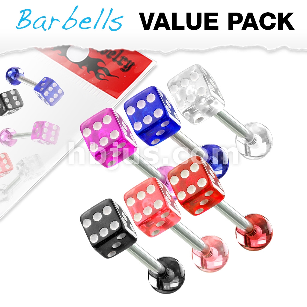 6 Pcs Value Pack of Assorted Color 316L Surgical Steel Barbells with Acrylic Dice