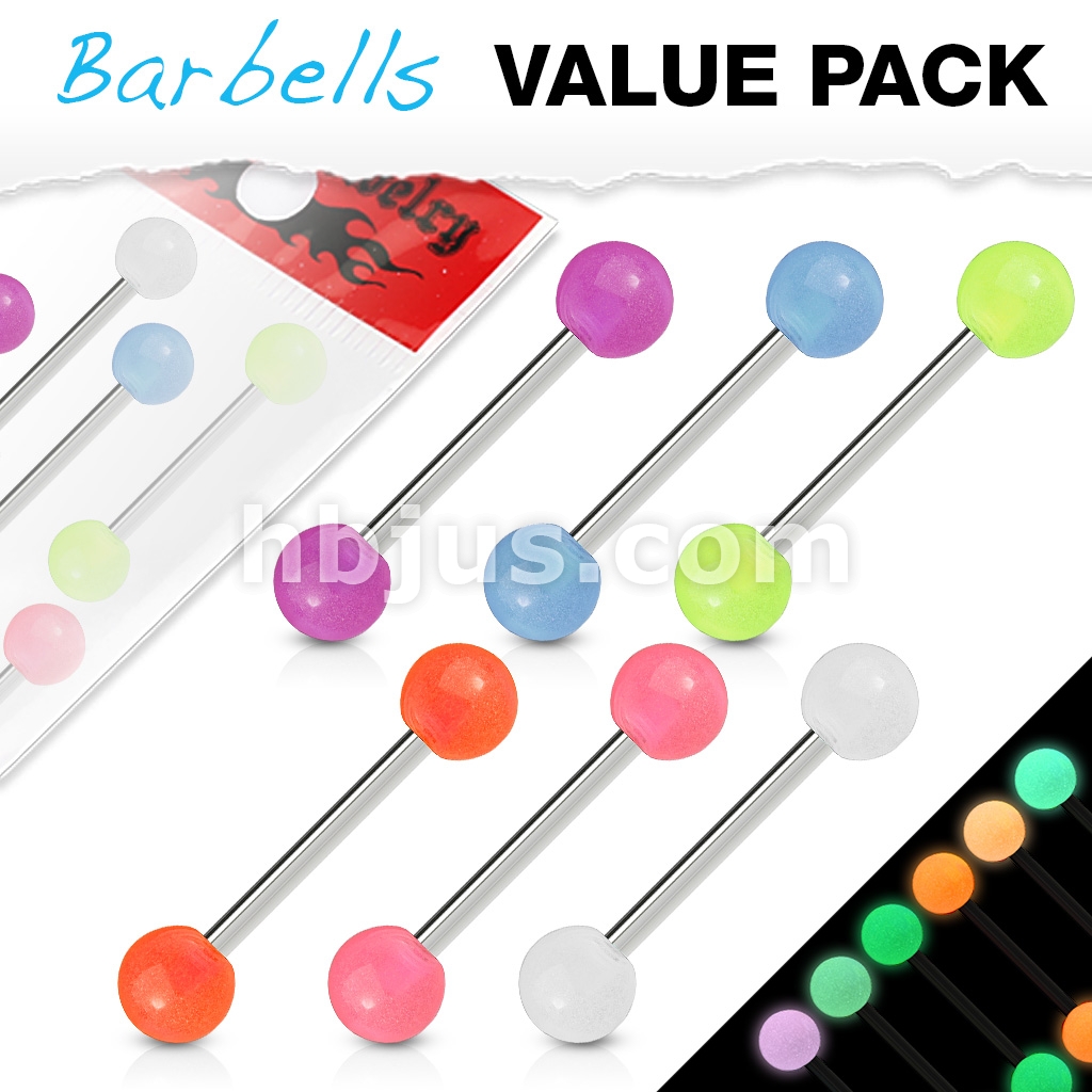 6 Pcs Value Pack of Assorted Color 316L Surgical Steel Barbells with Glow In The Dark Balls