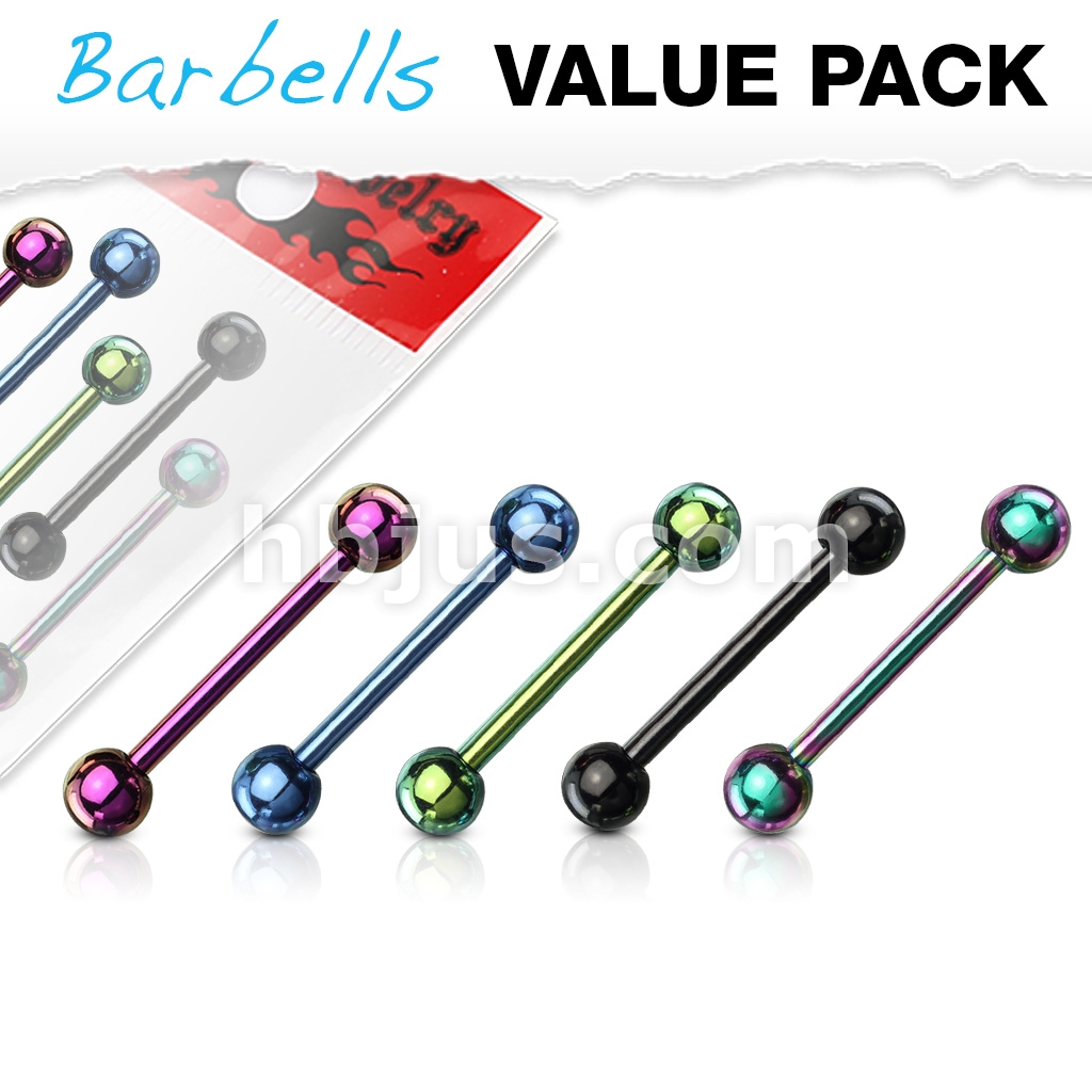 5 Pcs Value Pack of Assorted Color Titanium IP Over 316L Stainless Steel Barbells