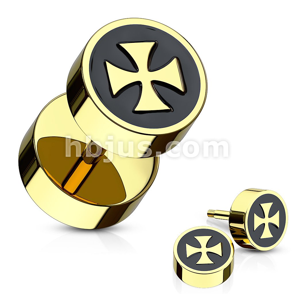 Iron Cross with Black Inlay Fake Plug Gold IP Over 316L Surgical Steel