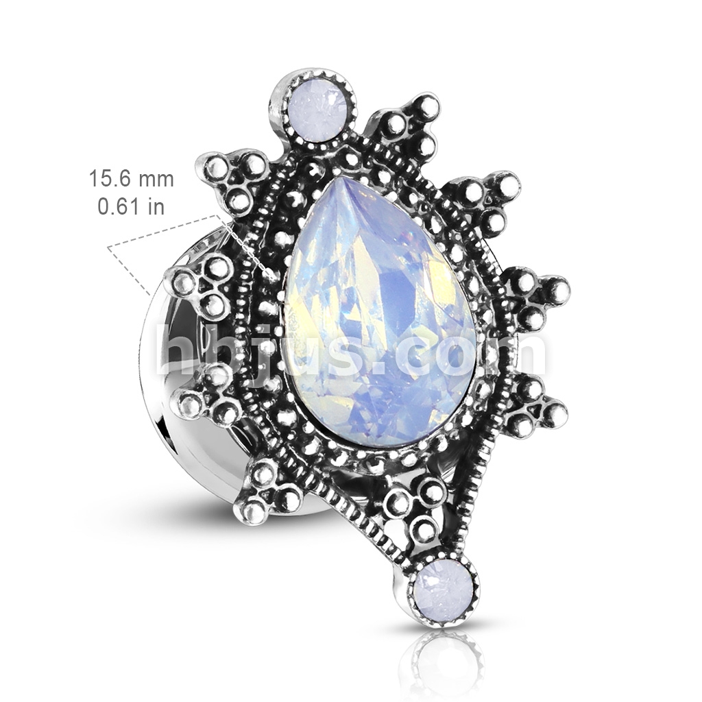 Faceted Opalite Center Vintage Antique Silver Plated Tear Drop Top Double Flared Tunnels