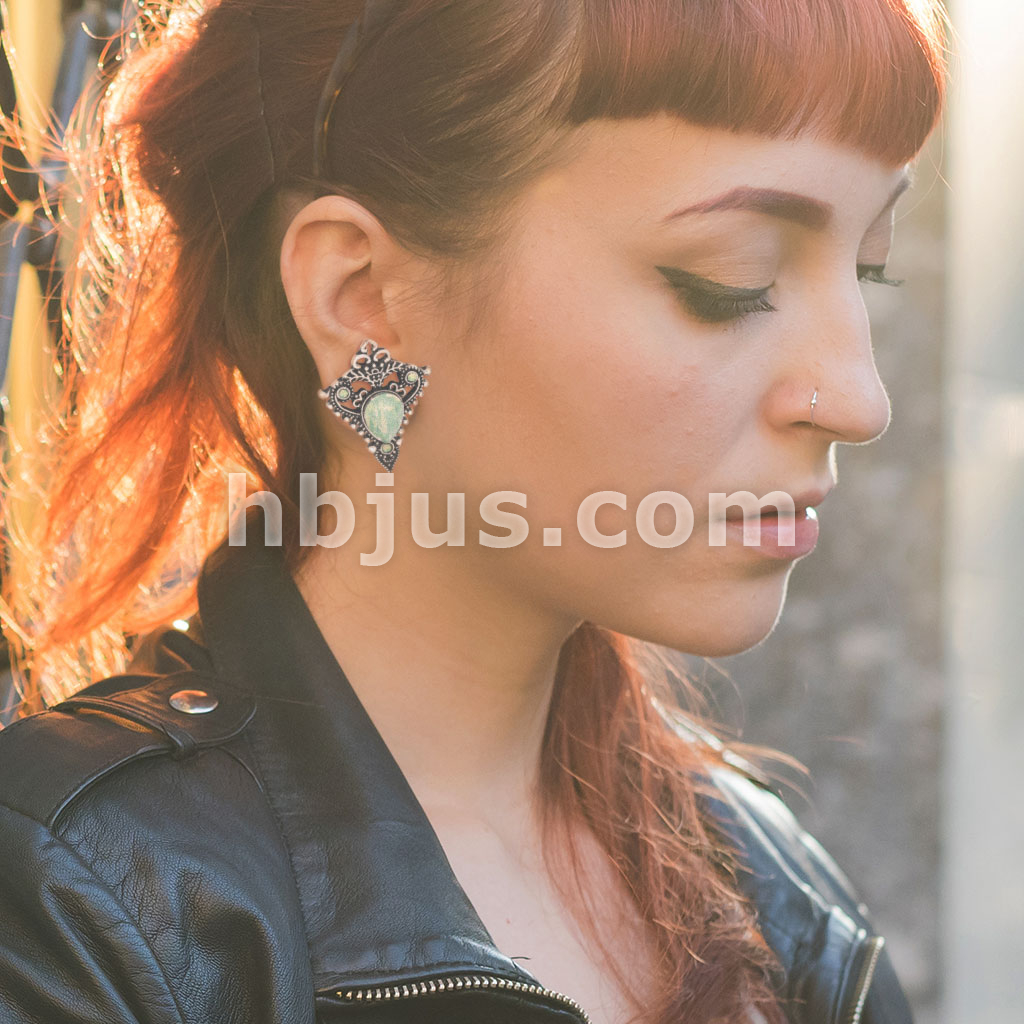 Jade Green Tear Drop Opalite Stone Set Tribal Shield Front 316L Surgical Steel Double Flared Tunnels