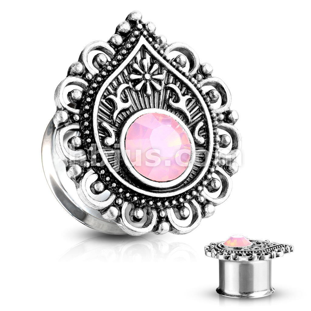 Pink Opalite Stone Centered Tear Drop Filigree Front 316L Surgical Steel Double Flared Tunnels