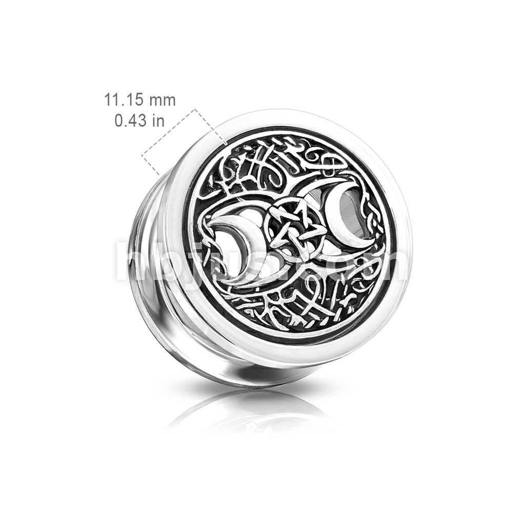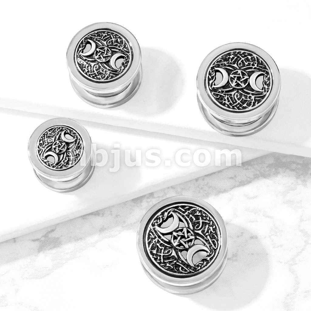 Antique Silver Plated Two Crescent Moons and Star Center 316L Surgical Steel Screw Fit Flesh Tunnel Plugs