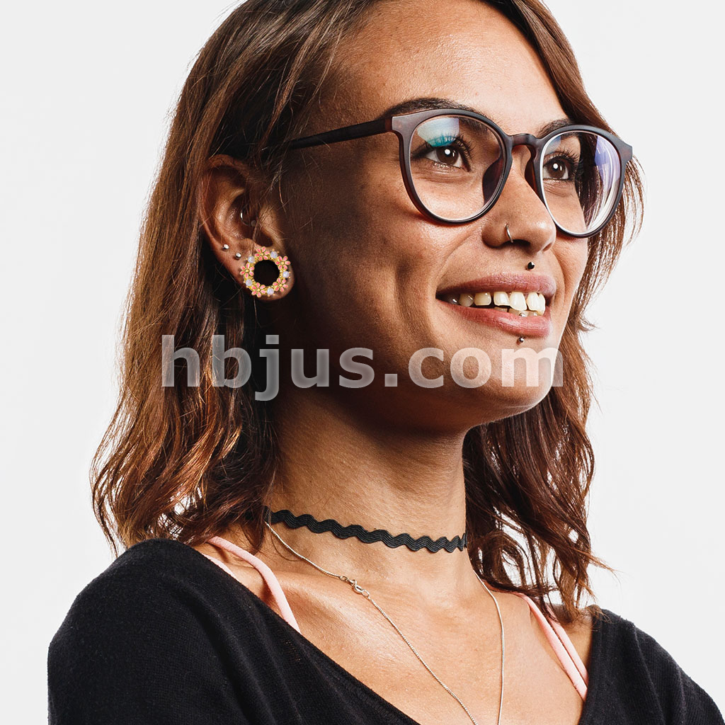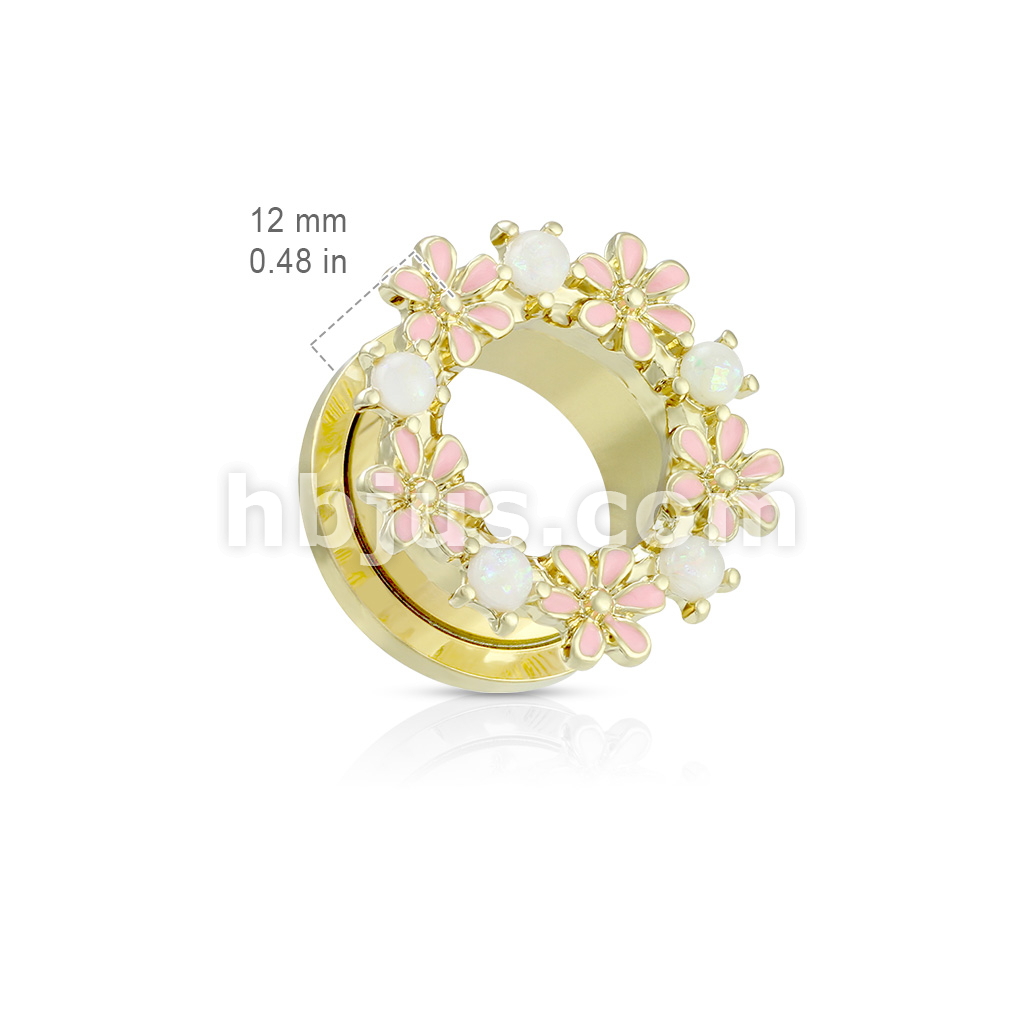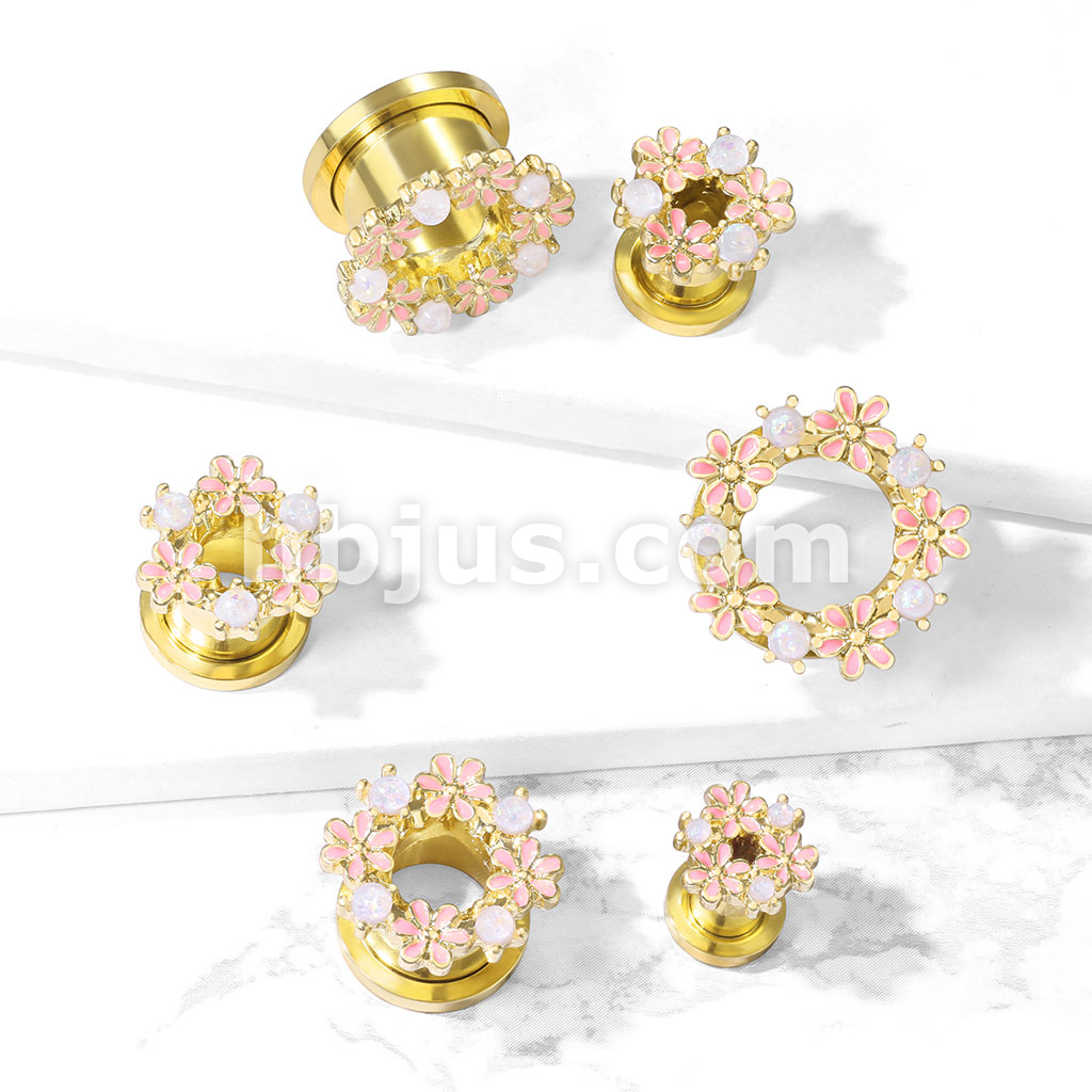 Opalite Stones and Enamel Flowers Gold PVD Over 316L Surgical Steel Screw Fit Flesh Tunnel Plugs