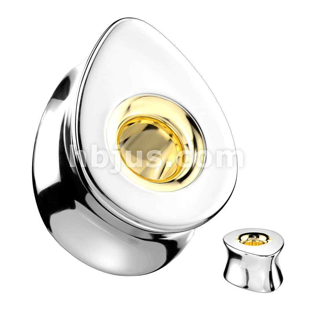 Solid 316L Surgical Steel Double Flared Teardrop Saddle Plug With Gold Hollow Center