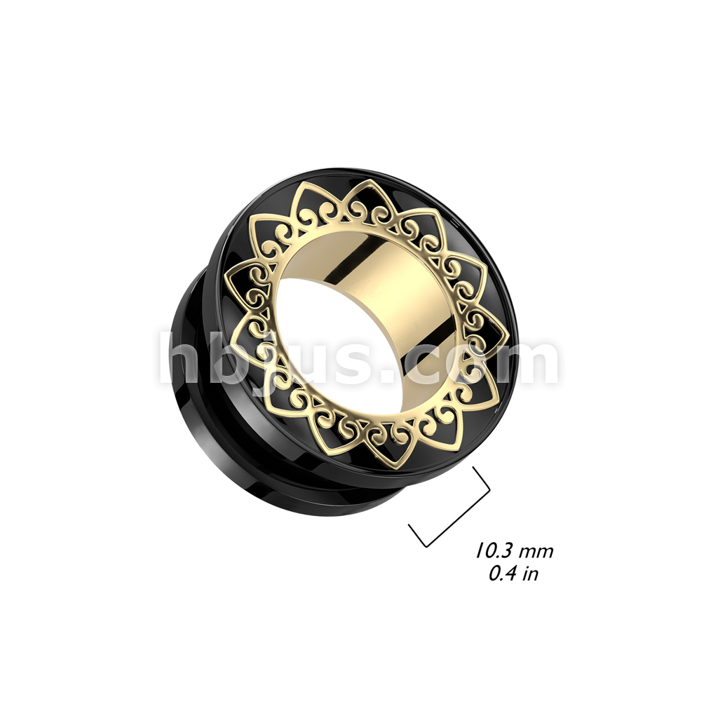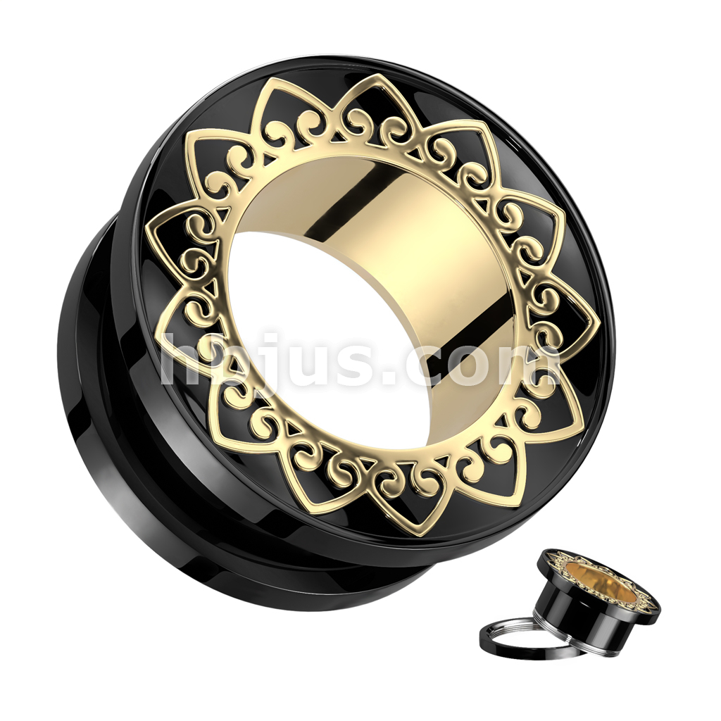 Gold Filigree Rim and Tunnel Black PVD over 316L Surgical Steel Screw Fit Tunnel