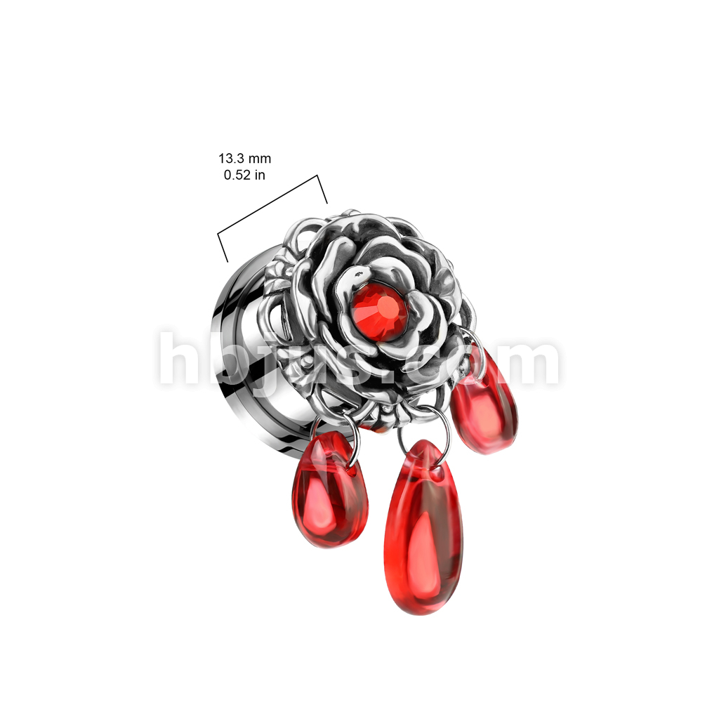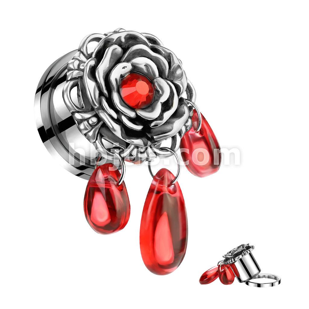 Flower With Red Gem Center and 3 Red Glass Dangle 316L Surgical Steel Screw Fit Tunnel
